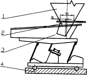 電磁振動(dòng)給料機(jī)的振幅和給料量受料倉(cāng)倉(cāng)壓影響較大,設(shè)計(jì)料倉(cāng)時(shí)應(yīng)盡量減少倉(cāng)壓,使溜咀后側(cè)板承受一定的倉(cāng)壓,并設(shè)置斜溜沮及下料閘門。如圖,一般a=1/4b。溜咀四周應(yīng)與給料槽留有一定的間隙,一般5~10mm,以免產(chǎn)生噪音及影響振動(dòng)。